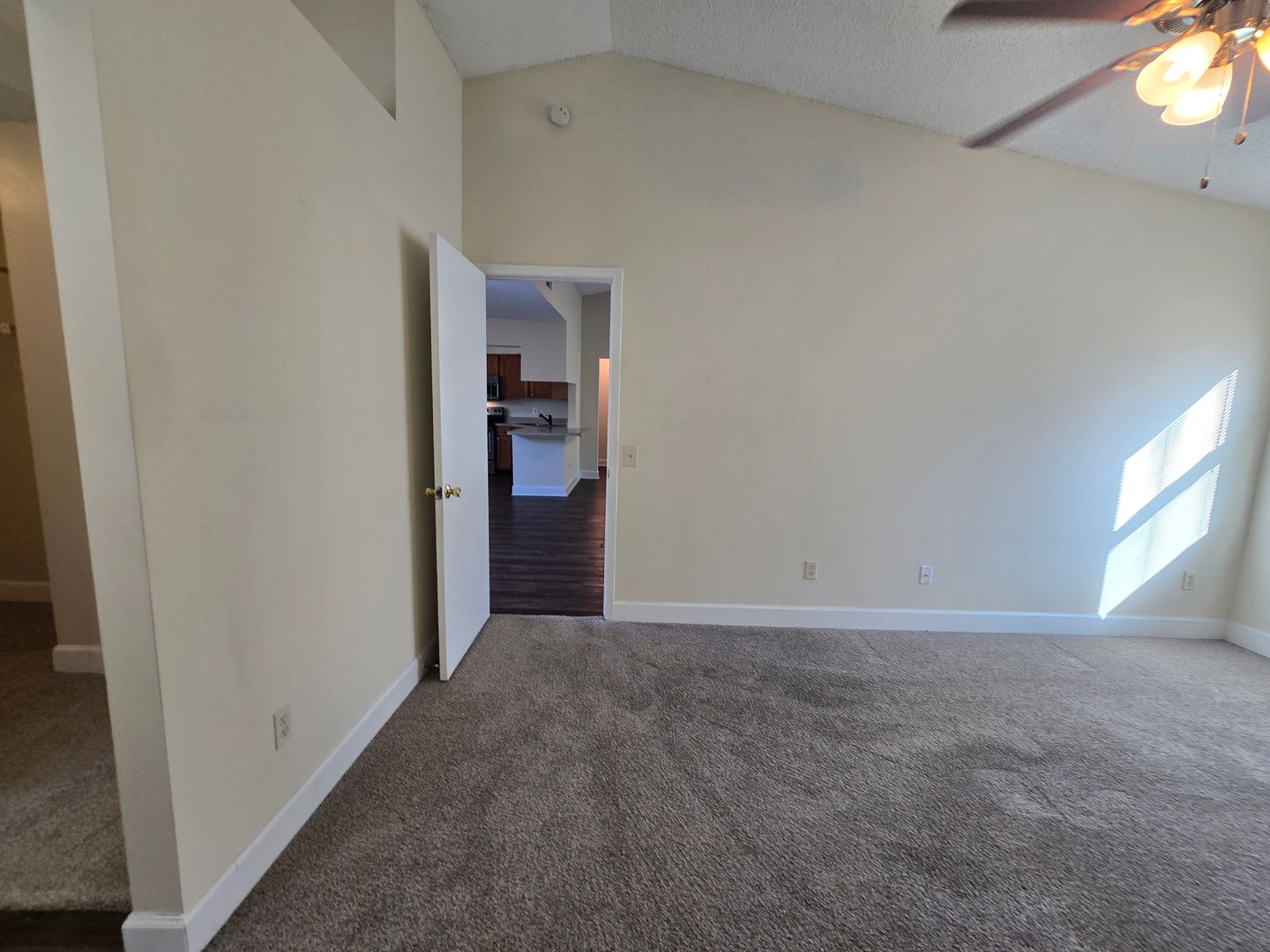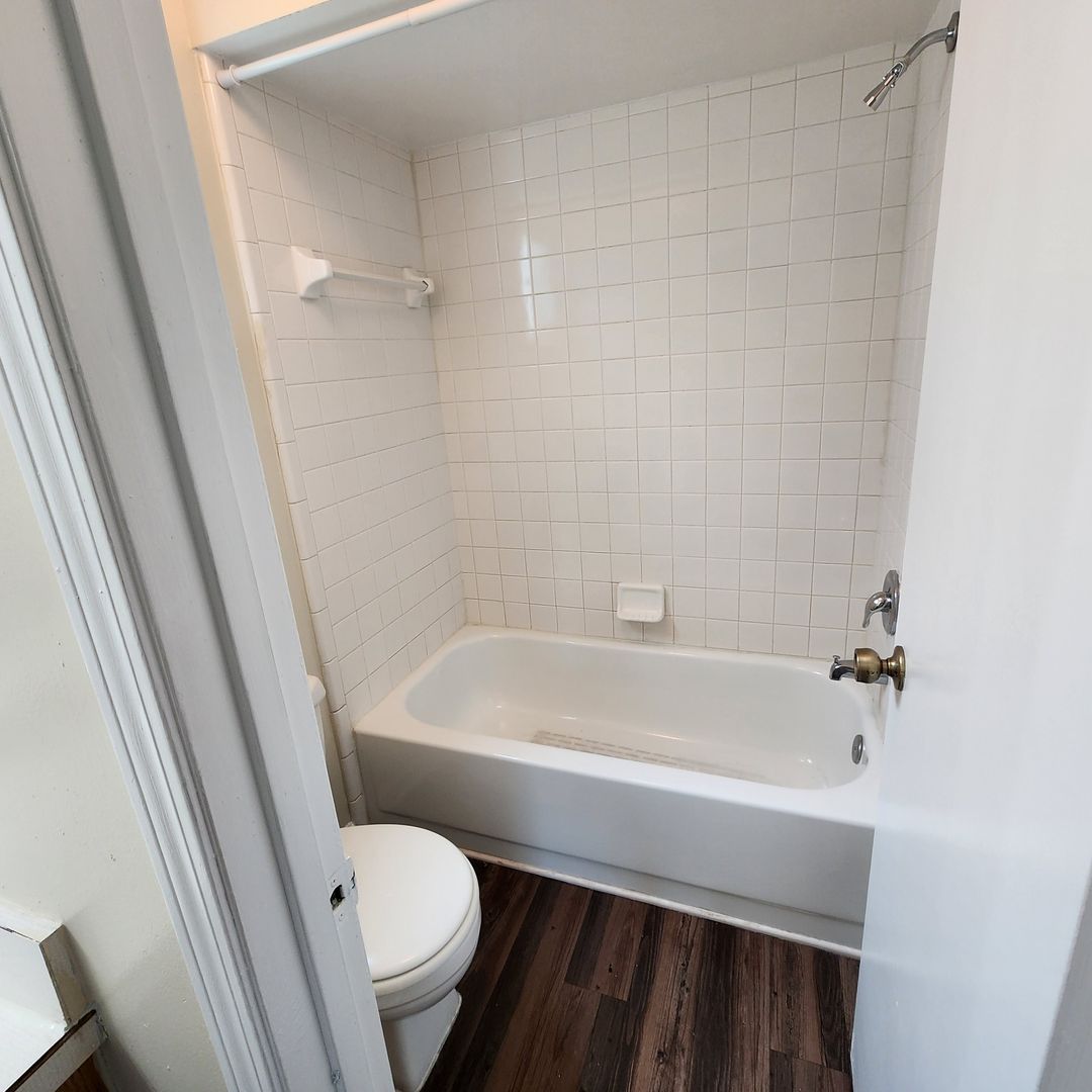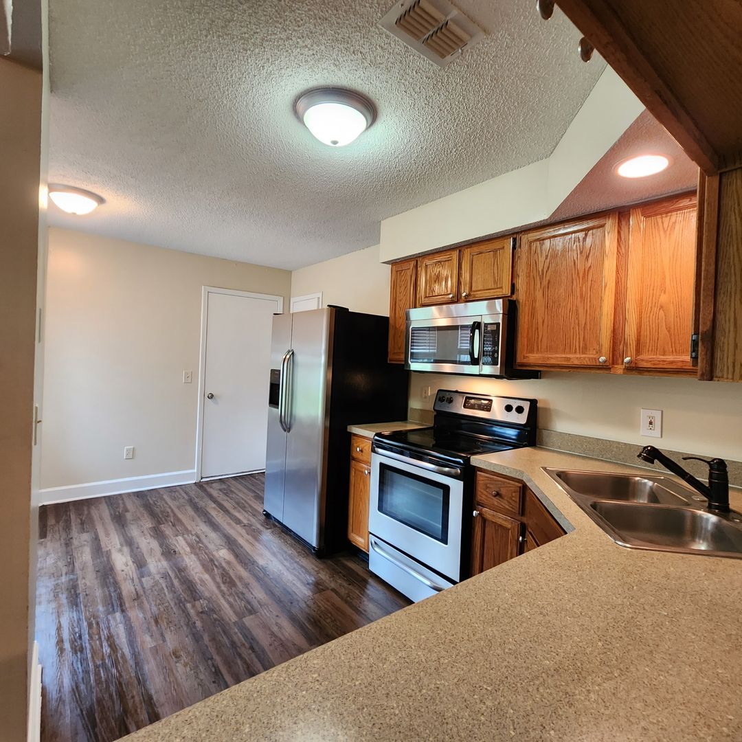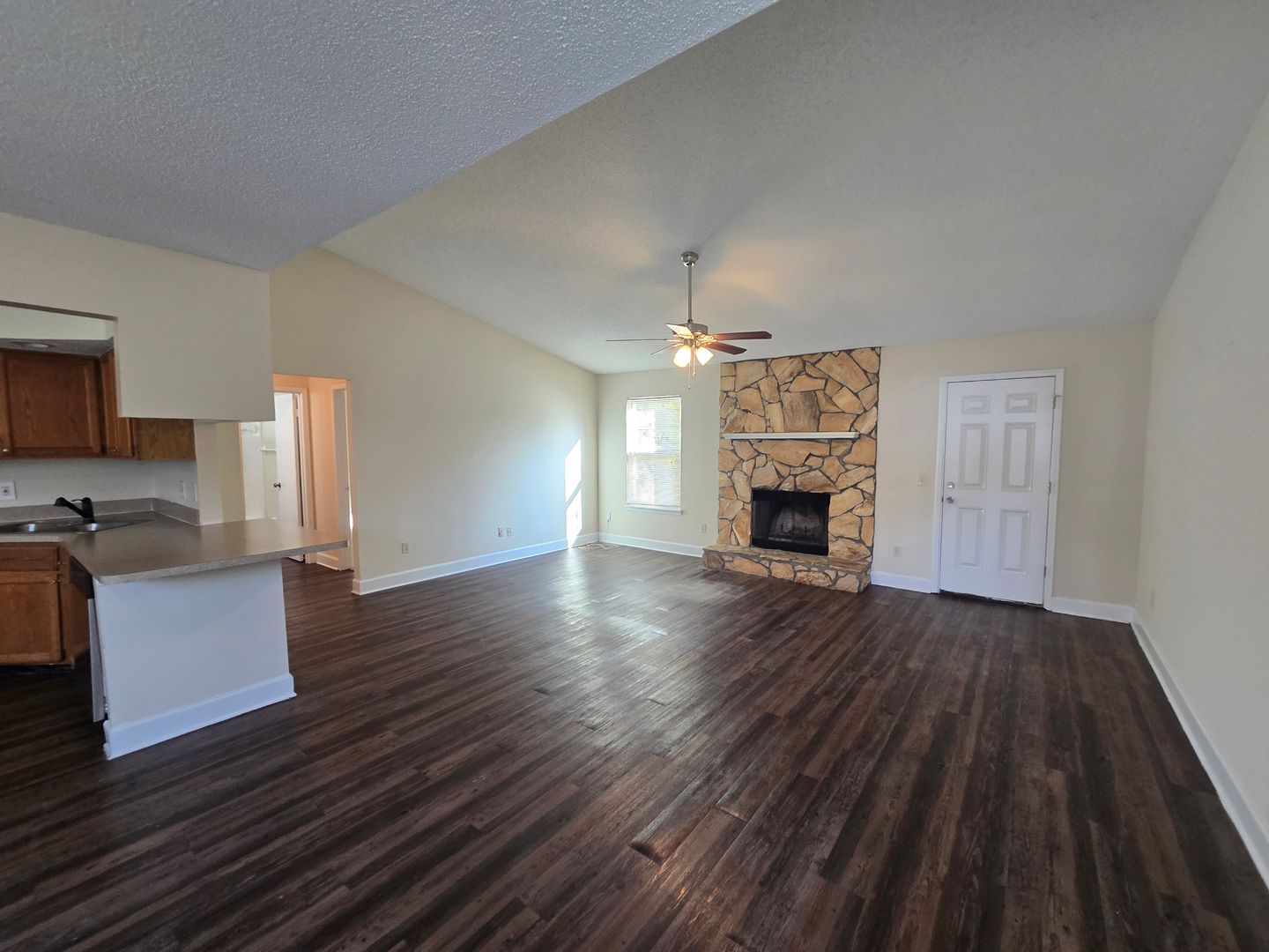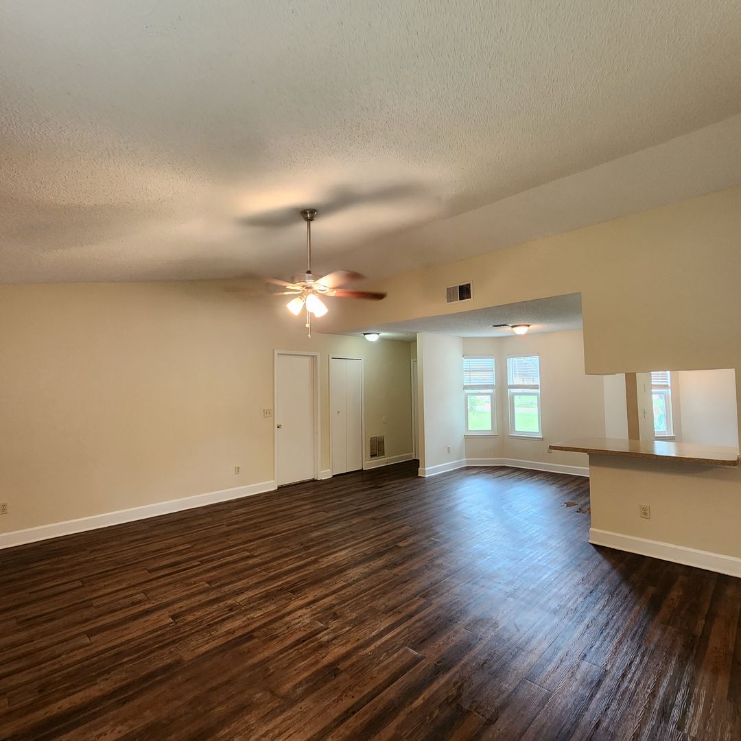 3/2 Open living/dining spaces with a wood-burning fireplace, wood-like plank flooring in all the living spaces. Photos show the home's current condition, and it is a must-see rental!